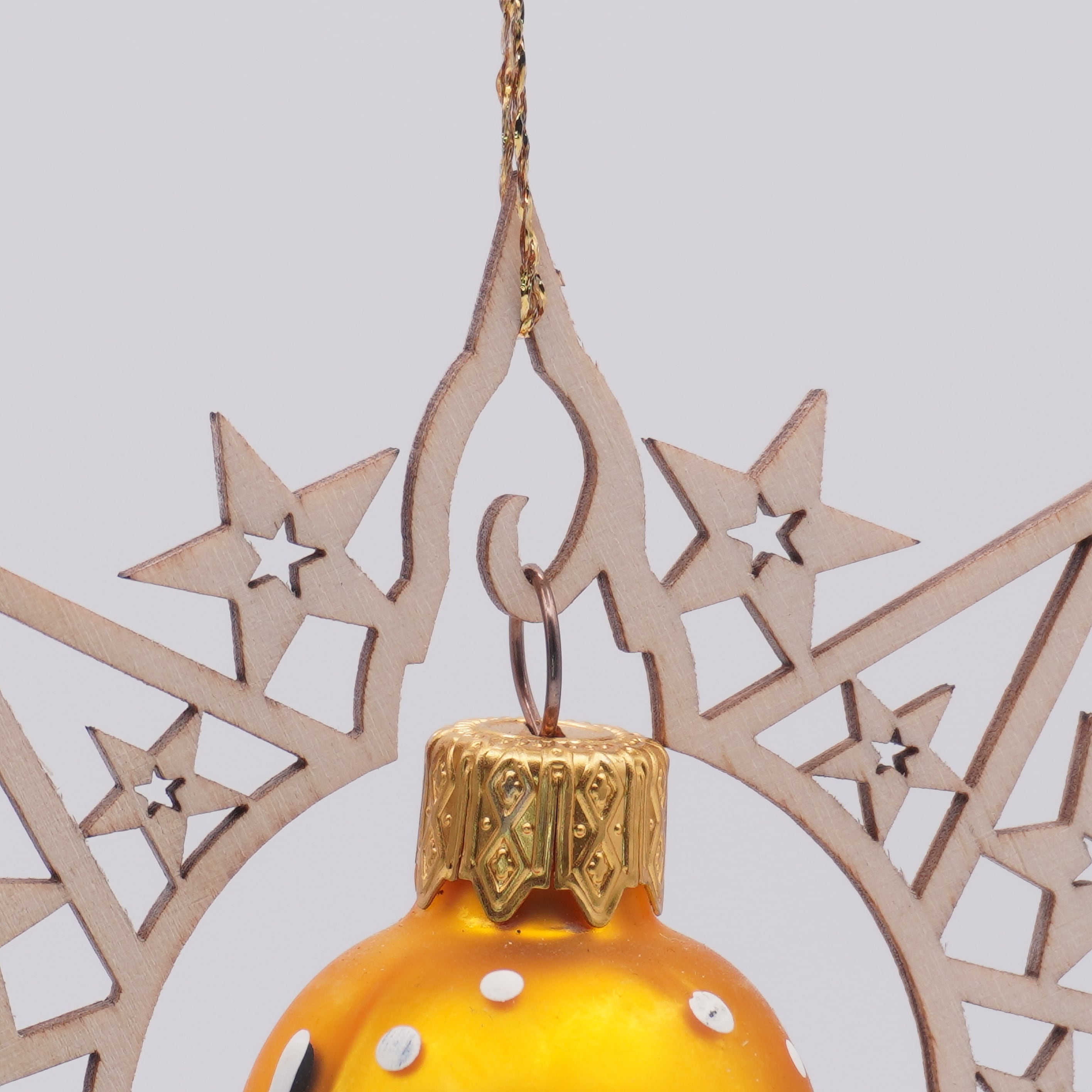 木で作られた星型の枠の中に小さな丸いオーナメントが吊り下げられていると言う凝った作りをしています。